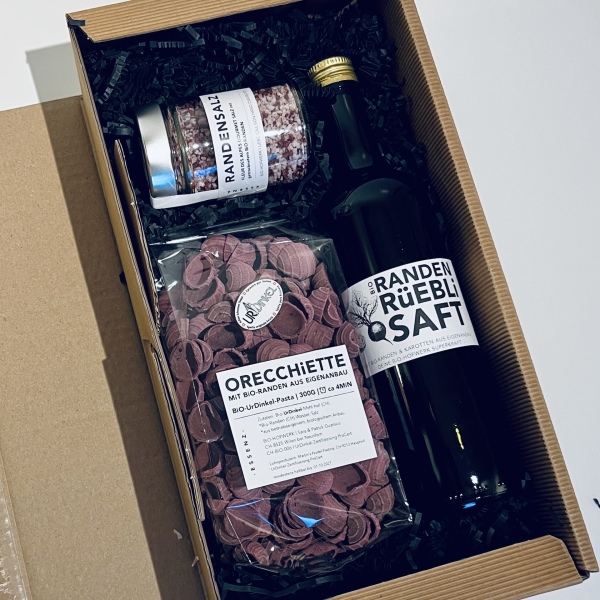 1 RandenRüebliSaft , 1 Randensalz, 1 Bio-UrDikel-Pasta Randen-Orecchiette 300g