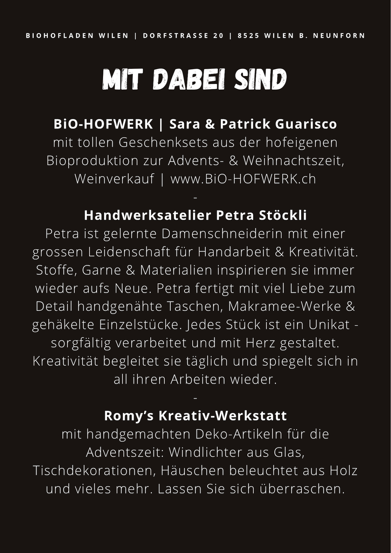 Am 5./12./19. Dezember 2025 öffnen wir unser DEGU-RüüMLi von 18 bis 22 Uhr - es erwartet Dich ein kleiner Adventsmarkt mit dem Handwerksatelier Petra Stöckli & Romy's Kreativ-Werkstatt sowie ganz viele tolle Geschenkideen vom BiO-HOFWERK & Weinverkauf.